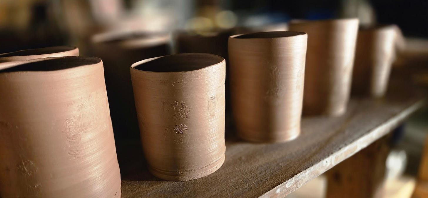 All those mugs I had a fun time throwing in the Facebook live feed were trimmed, and texture patterns were put on them. I just need to put handles on them all. I had to dip them all in water to rehydrate them as I had miscalculated on how fast things would dry. When I trimmed them before work yesterday, they were still a little damp so I just flipped them all and left them out. After a check after work this morning, they were all dried out a little too much, so they are now under plastic. I hope to handle them after I get up after work tomorrow afternoon. That’s if I can get to sleep.